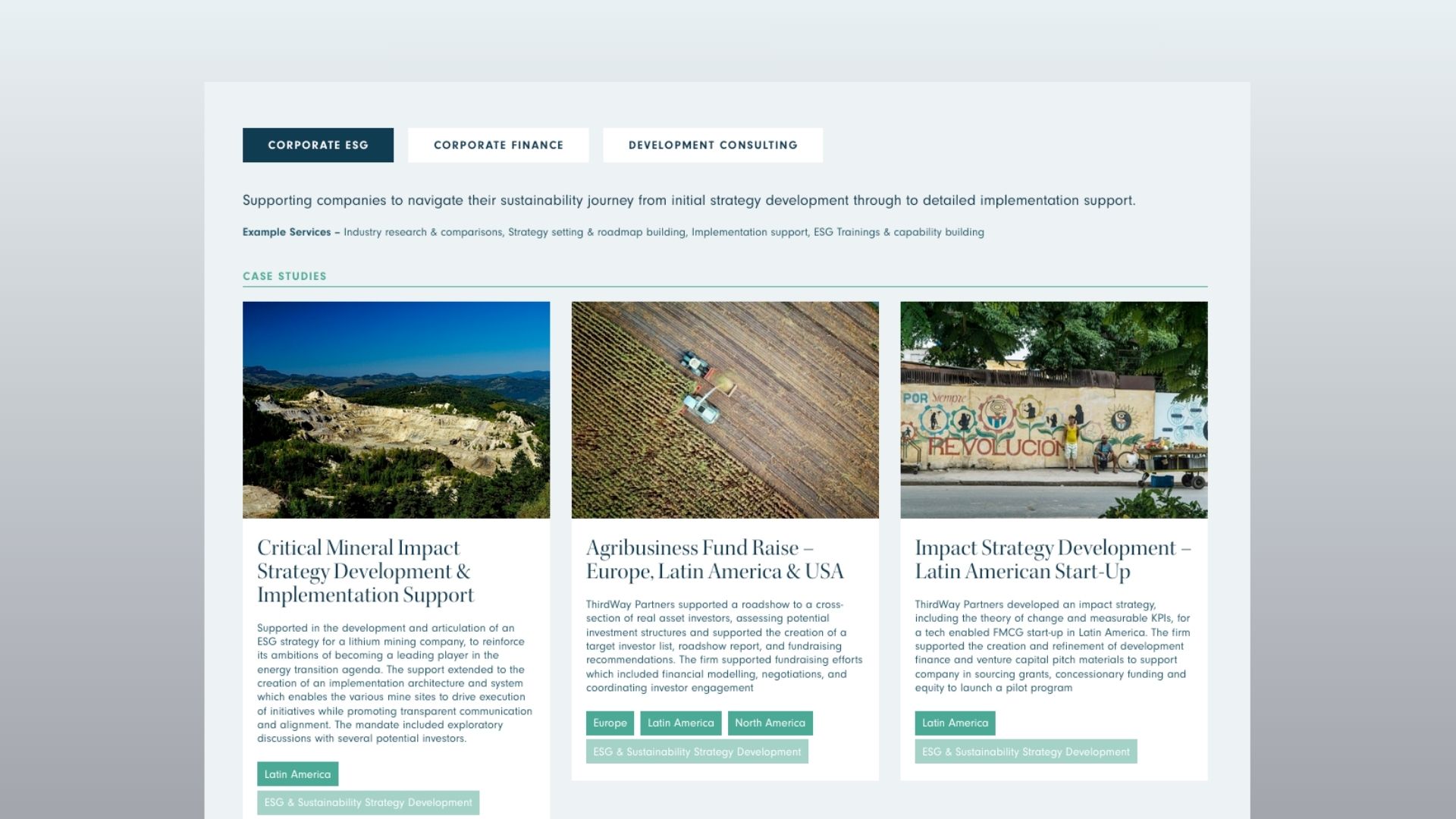 ThirdWay Partners is an investment and advisory firm focused on sustainable development. I led both design and development for this project, creating a smooth, minimal interface that feels refined and responsive across every device. Subtle motion and scroll-based transitions give the site presence without distraction, while every layout block was built for flexibility through a custom WordPress framework.